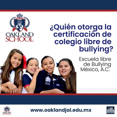 Escuela libre de Bullying México, A.C. el cual constantemente se evalúa. El acoso escolar tiene un impacto duradero en la salud física y emocional de los niños y niñas. En Oakland School comprendemos la importancia del bienestar de tus hijos, por lo cual somos un colegio certificado libre de bullying.